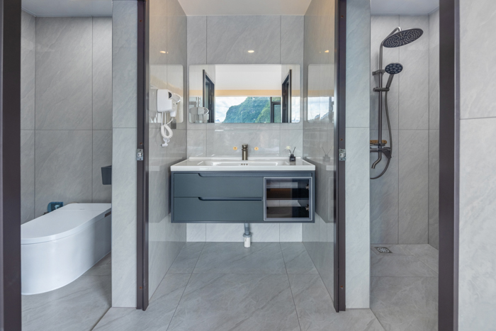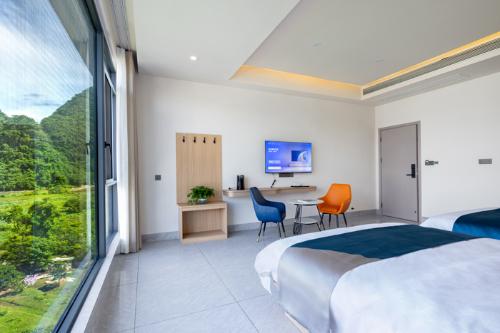 全屋都是超大落地玻璃,推窗就是喀斯特地貌美景,你可以在这里看骆驼过江日出!