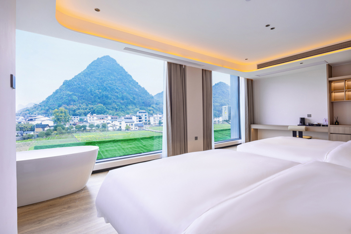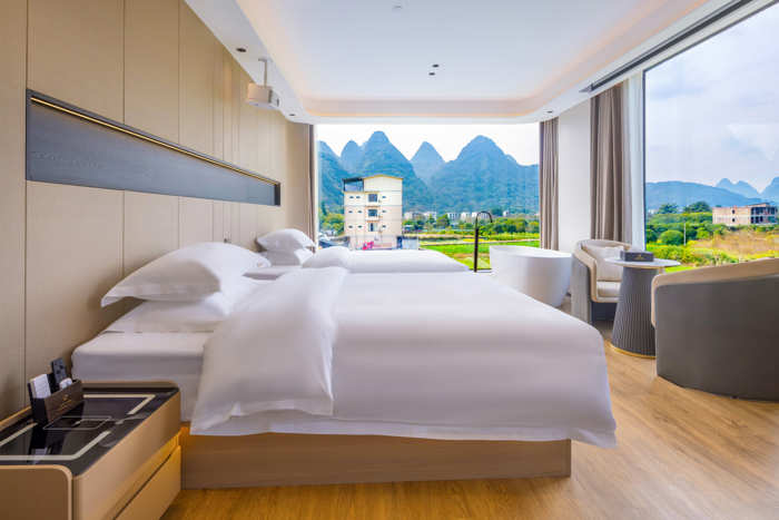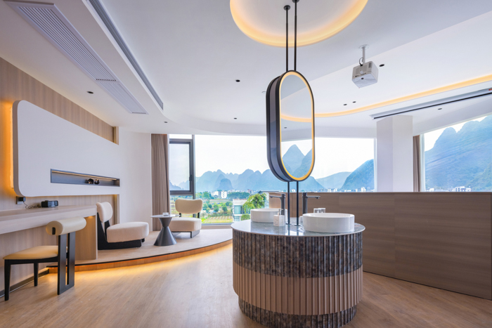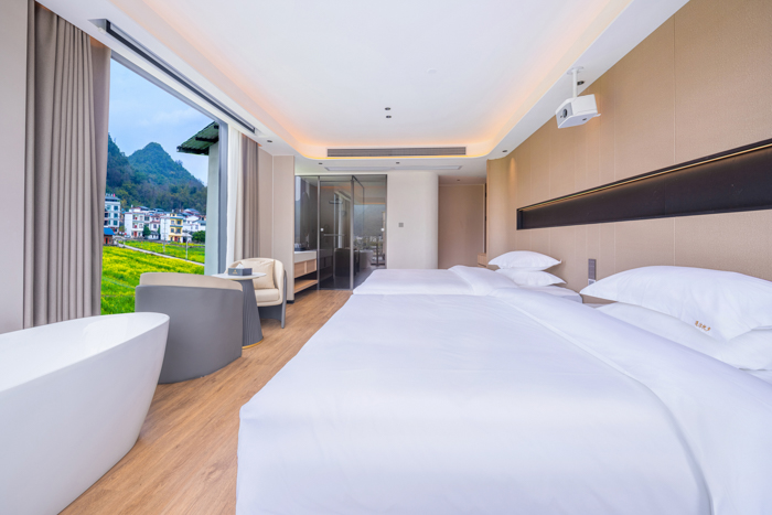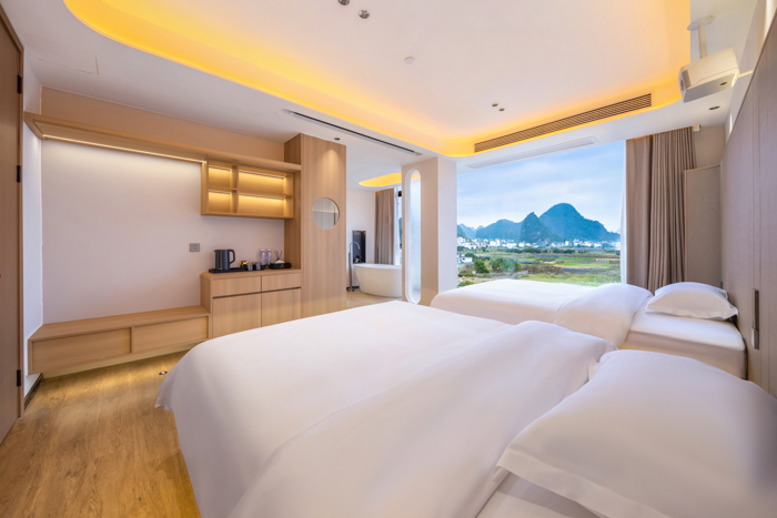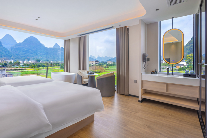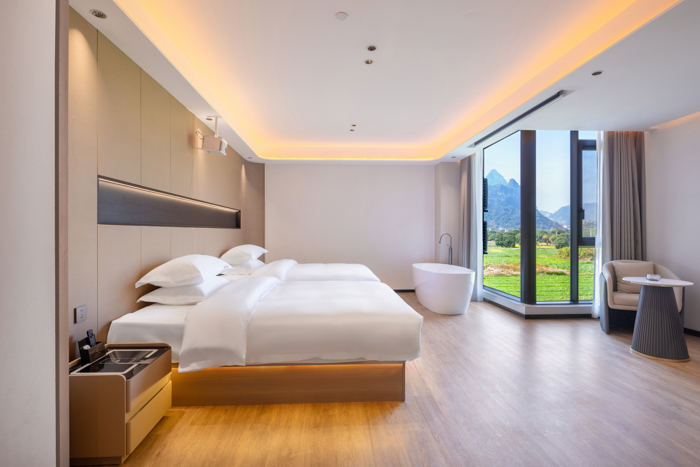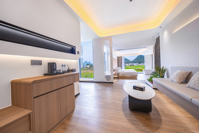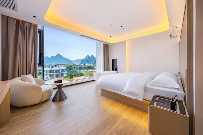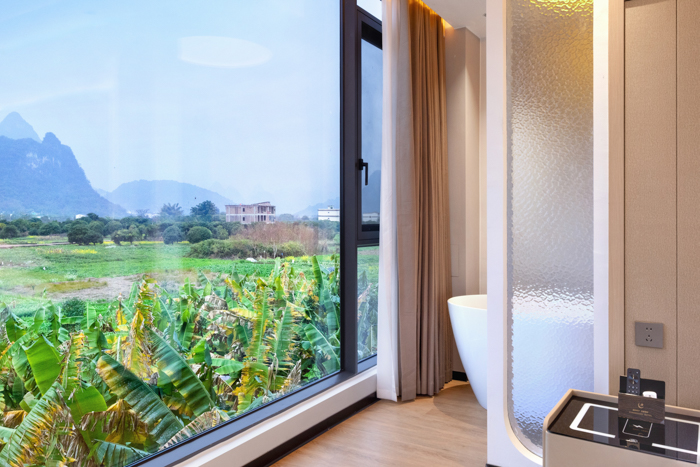 19间客房,从大床房到套房,每一间都精心布置,既能让客人沉浸式体验遇龙河的山水景观,又能享受到奢华的住宿体验。客房内设有超大观景窗,可尽览田园山峰美景。特别是楼顶270°观景露台,俯瞰整个遇龙河谷,视野开阔,景色壮丽。夜晚可以一边茗茶、品咖啡,一边欣赏星空,太浪漫了!