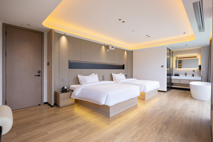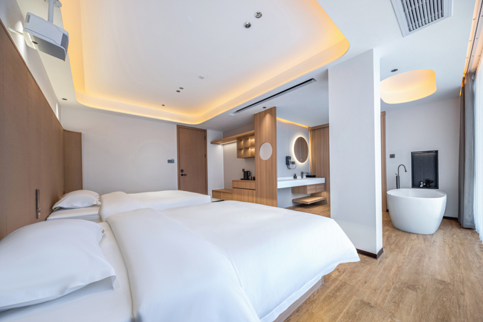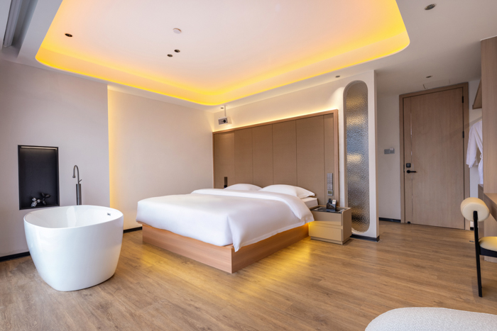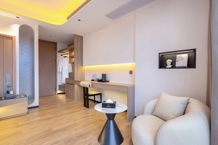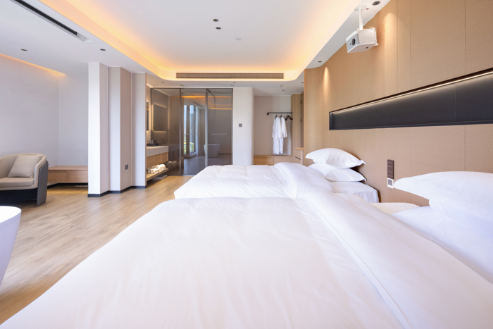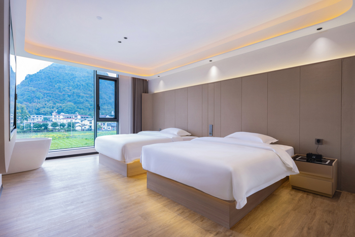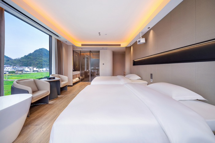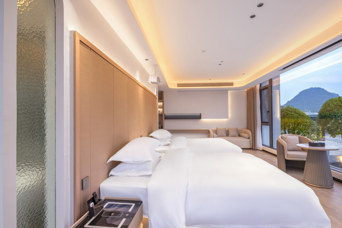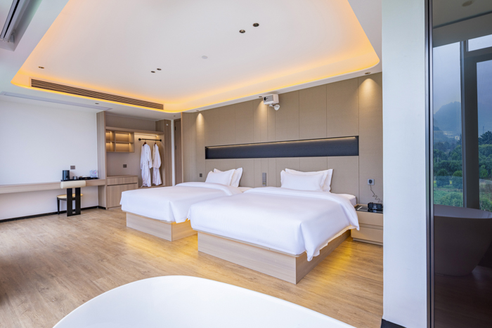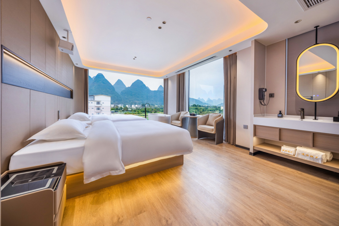 19间客房,从大床房到套房,每一间都精心布置,既能让客人沉浸式体验遇龙河的山水景观,又能享受到奢华的住宿体验。客房内设有超大观景窗,可尽览田园山峰美景。特别是楼顶270°观景露台,俯瞰整个遇龙河谷,视野开阔,景色壮丽。夜晚可以一边茗茶、品咖啡,一边欣赏星空,太浪漫了!