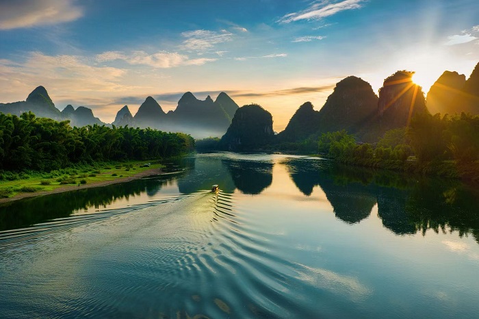荔江湾由形象的鹞鹰山、象鼻山、五指山、龙头山、白石山、红马、白马山和珠江支流--荔江河及沿河两岸的生态田园风光组成,日出日落都很美。这里也是桂林首个国家级湿地公园,目前景区开辟有山上索道、玻璃栈道、溶洞等,也是旅行观光好出去。