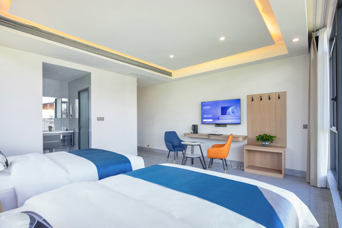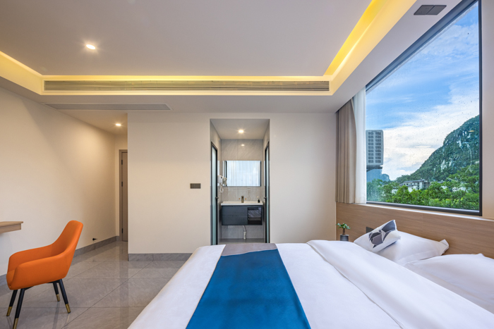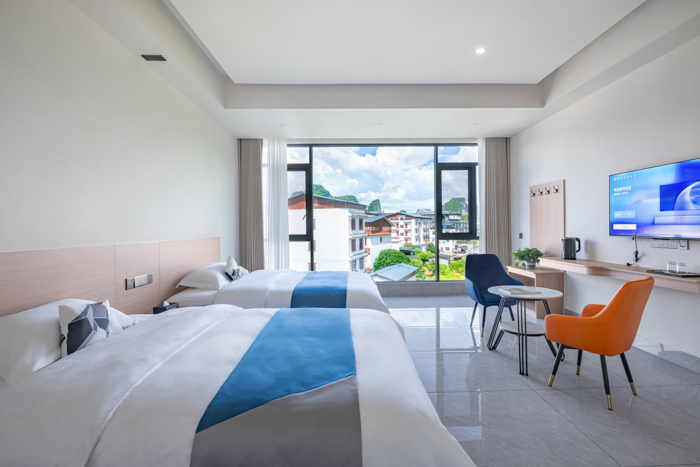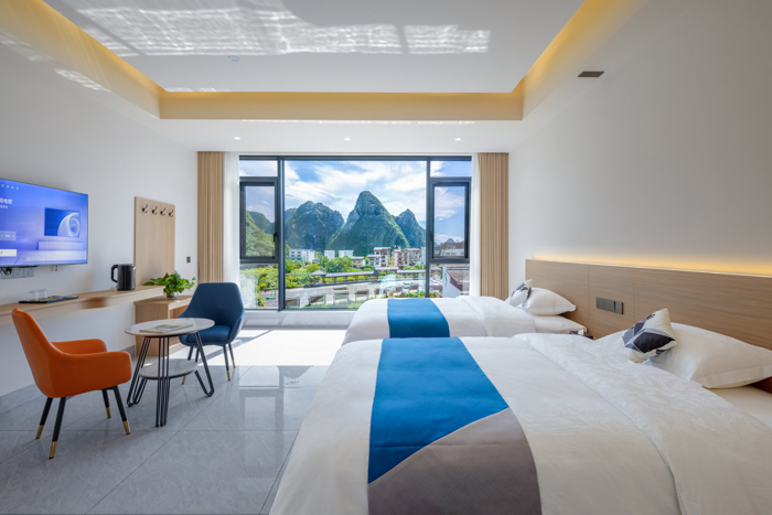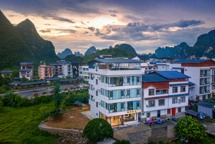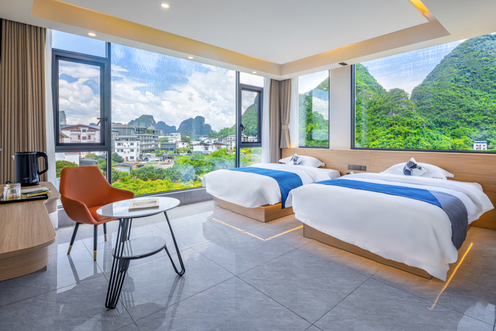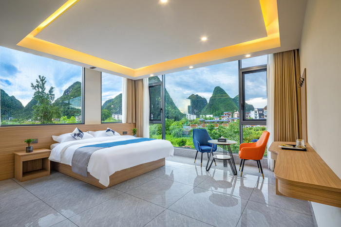 全屋都是超大落地玻璃,推窗就是喀斯特地貌美景,你可以在这里看骆驼过江日出!