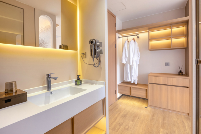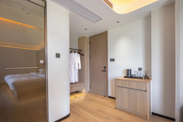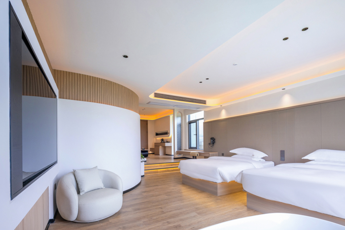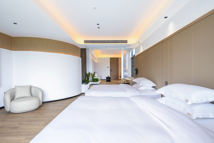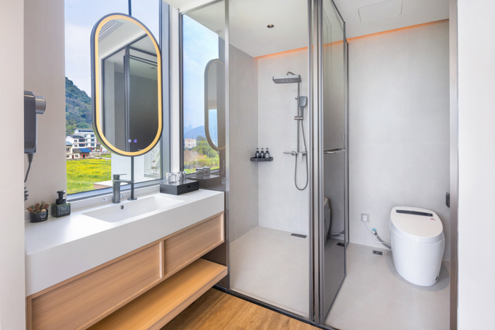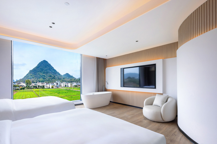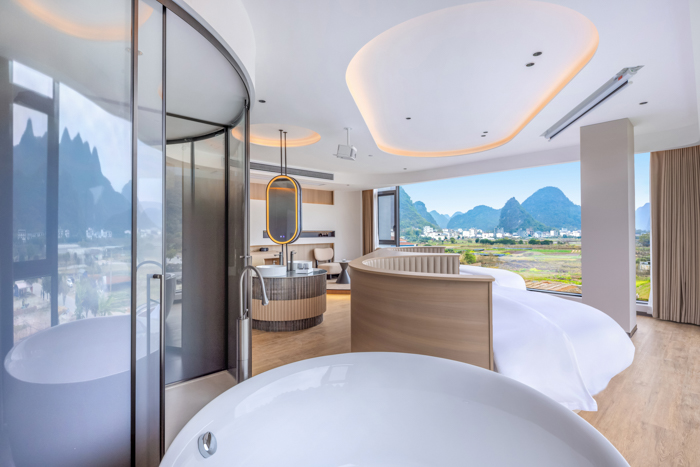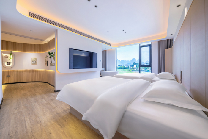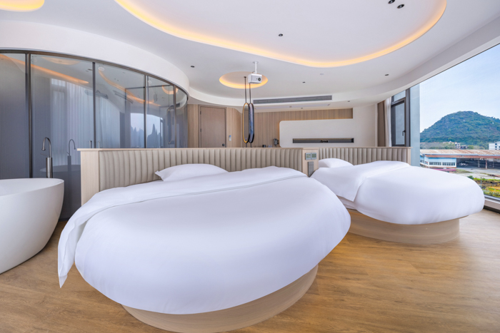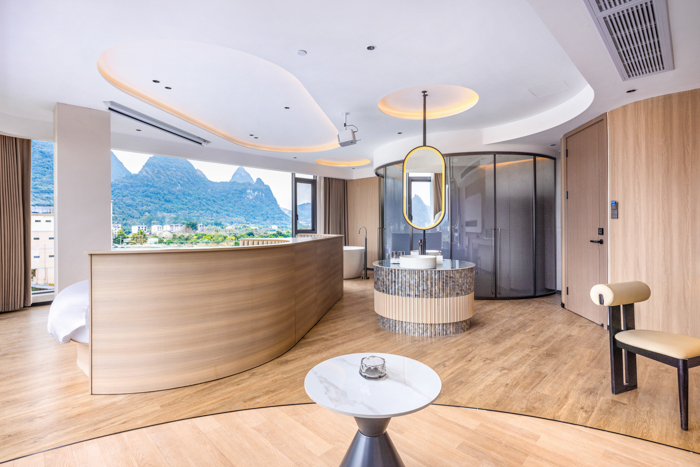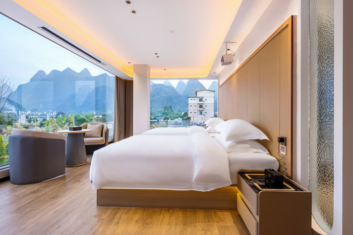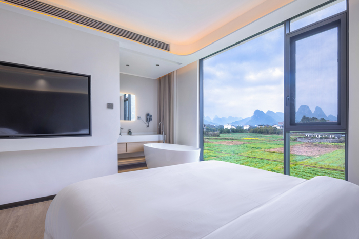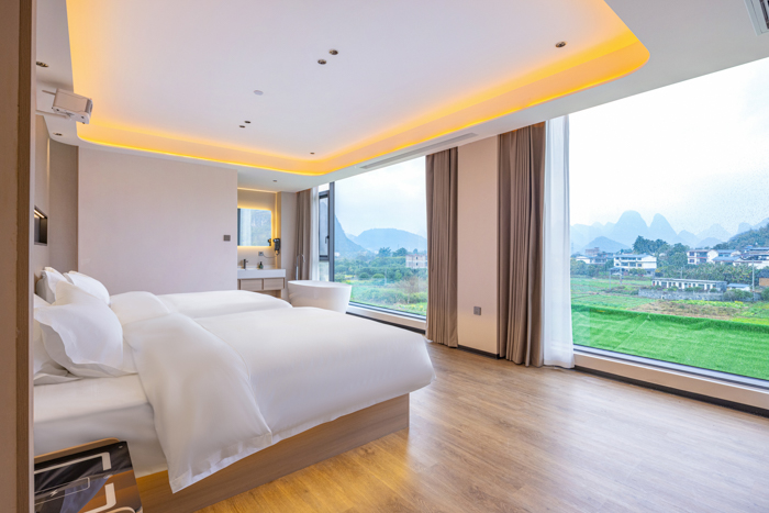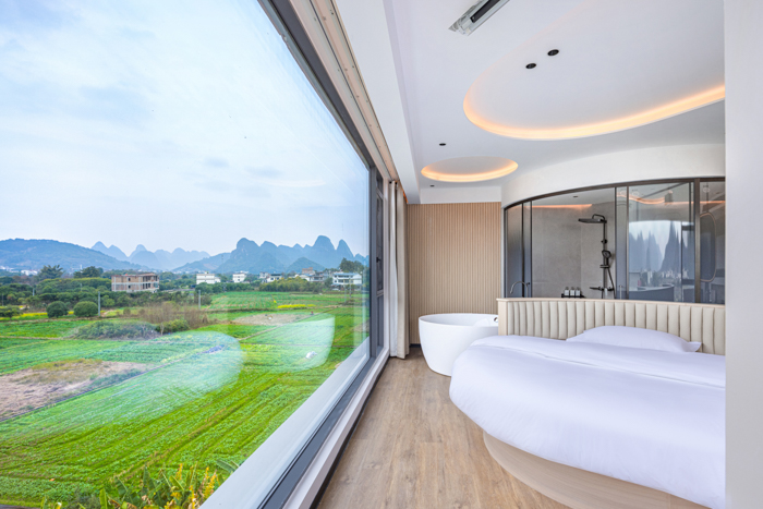 19间客房,从大床房到套房,每一间都精心布置,既能让客人沉浸式体验遇龙河的山水景观,又能享受到奢华的住宿体验。客房内设有超大观景窗,可尽览田园山峰美景。特别是楼顶270°观景露台,俯瞰整个遇龙河谷,视野开阔,景色壮丽。夜晚可以一边茗茶、品咖啡,一边欣赏星空,太浪漫了!